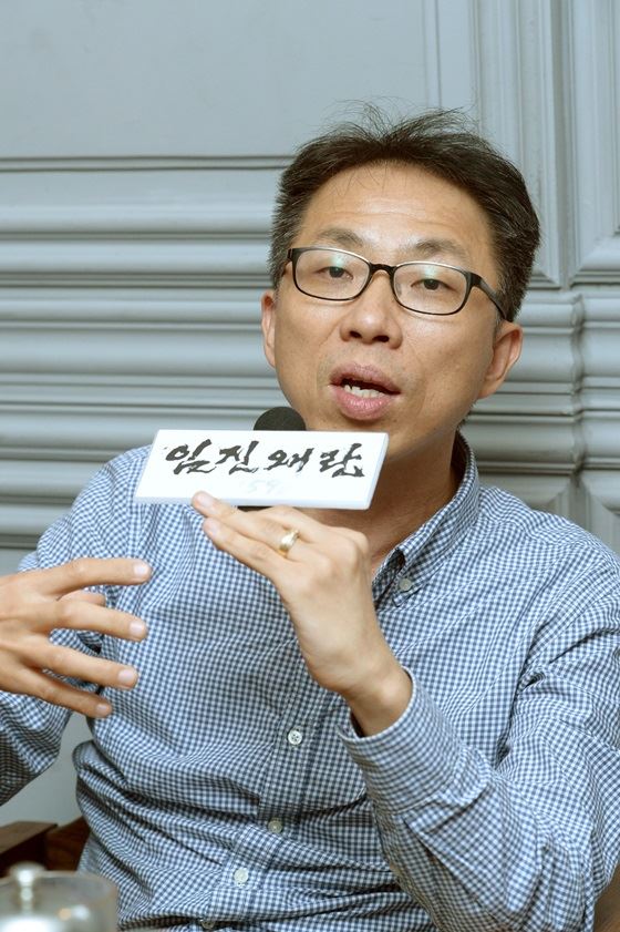 스캇 박 두산밥캣 대표(왼쪽)가 5일(미국 현지시간) CES 2026 미디어데이에서 밥캣의 표준 배터리팩에 대한 설명을 하고 있다. (사진=두산밥캣)