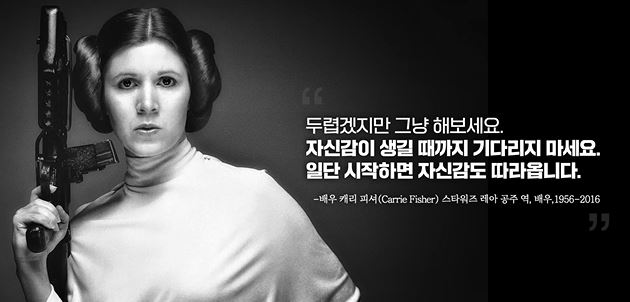 영화 ‘스타워즈’에서 레아 공주 역을 맡았던 배우 캐리피셔의 말을 인용한 그는 “두렵겠지만 일단 해보라. 자신감이 생길 때까지 기다리지 마라. 일단 하면 자신감은 따라온다”고 말했다.