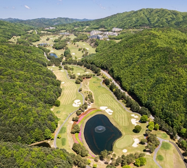 울창한 참나무 숲 속 화려한 야생화와 계곡 등 압도적인 대자연 속에서 즐기는 라운드는 특별하다. 첫홀부터 코스 우측에 워터 해저드가 길게 형성돼 있는 게 위협적이다. 긴 거리와 그린 앞의 벙커가 플레이에 상당히 부담을 주는 PAR 4홀이었다.