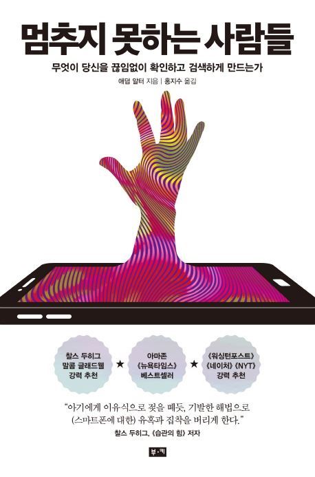 이 책은 행위 중독이 등장하게 된 배경을 추적하고, 오늘날 우리가 어떤 대상과 체험, 행위에 중독되어 있는지, 왜 중독되는지, 어째서 테크놀로지 제품과 기기 사용을 거부할 수도 멈출 수도 없는지 파헤친다. 나아가 행위 중독이 만연하고 있는 현실의 심각성을 경고하면서, 어떻게 하면 이를 퇴치하고 건강하고 행복한 삶, 바람직한 소통 방식, 진정한 인간관계를 회복할 수 있는지 길을 알려 준다. / ‘멈추지 못하는 사람들’ (애덤 알터 지음 | 홍지수 옮김 | 부키)