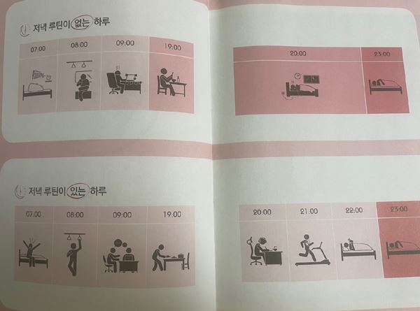 책 첫 장에는 저녁 루틴이 있는 하루와 저녁루틴이 없는 하루를 그림으로 재미있게 묘사했다. 저녁 7시에 저녁 식사를 한 후 밤 11시 잠들기 전까지 침대 위에서 스마트폰만 바라보던 자신에서 저녁 식사 후 공부, 운동, 독서를 하는 자신을 그려 넣음으로써 저녁 루틴을 묘사했다.